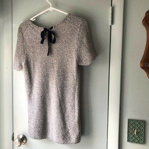 Gap short sleeve sweater scoop neck tie keyhole back...gray heather navy blue specks and ribbon..size medium...super soft...see measurements for correct fit 18" pit to pit and 25" center back length