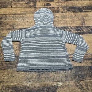 Cozy striped knit sweater from GAP featuring a hood and long sleeves. Made with a rayon and linen blend for comfort. Horizontal stripe pattern throughout in gray and white. In good pre-owned condition with no major flaws. Perfect for layering.
