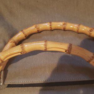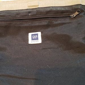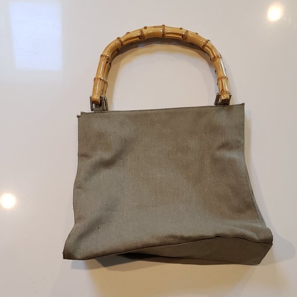 GAP Handbag with Bamboo Handles. I would describe the color being close to an Army Green. Outside fabric is a thick canvas type of material. Lining is black and has an inside zippered pocket. This bag is in good condition with no rips, tears or staining.
