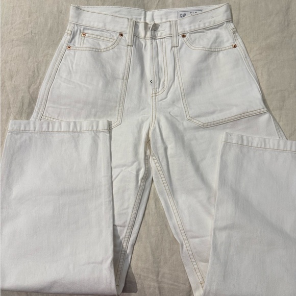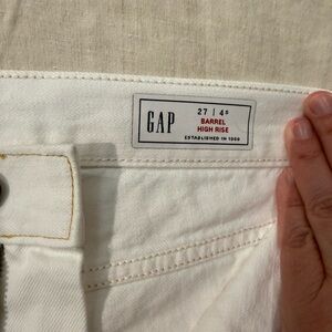 Women’s high-rise barrel jeans by GAP. Front patch pockets and clean seams. Worn twice and in perfect condition.