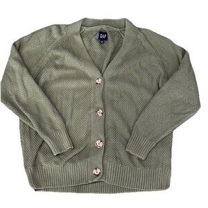 The product is a Gap Hunter Green Cardigan in size Large for women. This solid olive green sweater features a long sleeve and is made of acrylic material. It is a stylish and versatile cardigan for everyday wear, perfect for layering over your favorite outfit. Made in Indonesia, this cardigan is sure to become a staple in any woman's wardrobe.