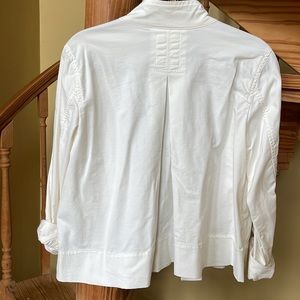 GAP never disappoints, so soft to the touch, front hidden button panel, side pockets, unexpected pleated back that gives this jacket such a unique design, wide end border, a bit on the egg shell white shade, size L NWT orig 69.95