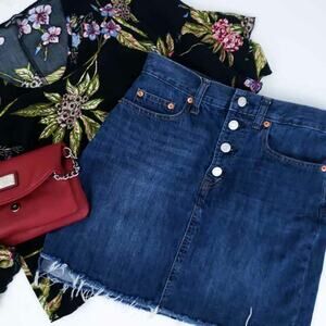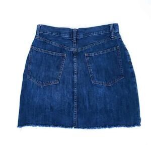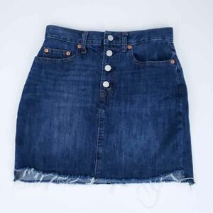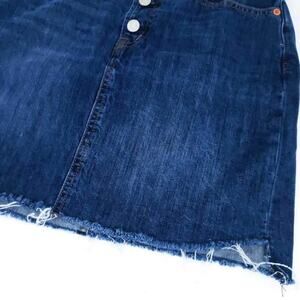 GAP Jean Skirt Button Front Raw Step Hem Blue 27. Size 27. Step hem, slightly shorter in front. 100% cotton. Excellent preowned condition. Five pocket design.