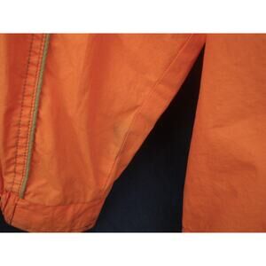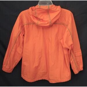 GAP Kids orange windbreaker jacket with gray trim, zip front hoodie, 100% cotton with 100% polyurethane coating to repel water, elasticized drawstring waist and elasticized cuffs. Lots of zipper pockets for random stuff! Tag Size 10 * Large. Well Loved but Still Good Overall Condition, no holes or rips. Faded, some surface wear and light staining on the areas you expect ...cuffs, edges, etc. Smoke Free Home.