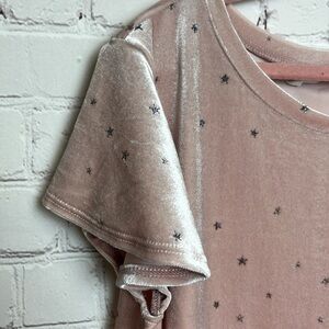 Gap blush (light pink) flutter sleeve velour dress with shiny silver stars all over. Drop waist style. Crew neckline.