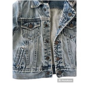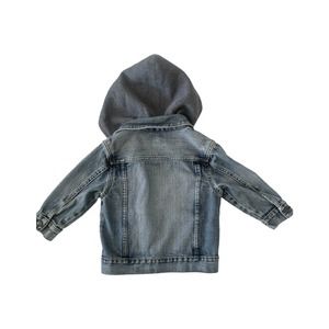 Stylish denim jacket with a cozy gray hood. Features button closure and front pockets. Perfect for layering.