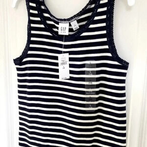 Get ready for fun in the sun with this adorable GAP Kids Navy Blue Girl's Lace Trim Tank! This classic striped tank top is a wardrobe staple that's perfect for any adventure, from playground fun to a day at the beach. The soft knit fabric and stylish lace trim add a touch of charm, making it a comfy and cute choice for any occasion.