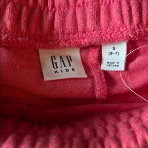 Bright pink skirt with elastic waistband. Features white drawstring and GAP logo. Blue mark pictured in last photo