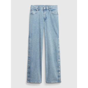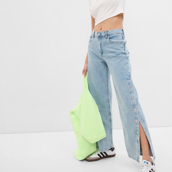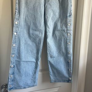 Stylish light blue jeans. Flare and wide leg design. Perfect for casual wear.