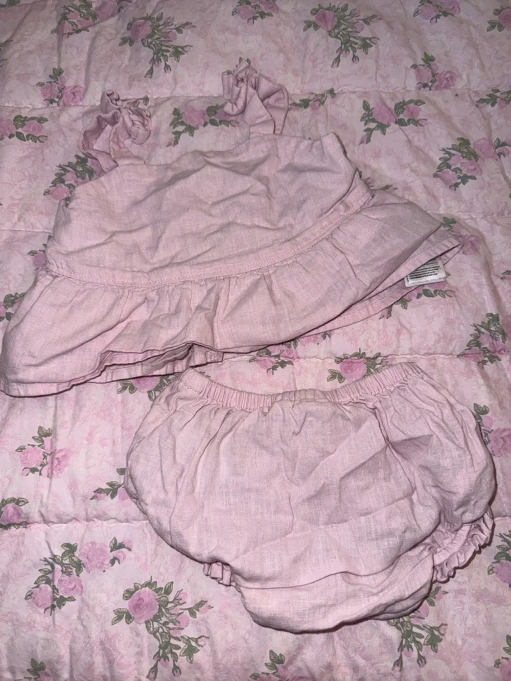 Soft light pink two-piece with ruffle trim. Breathable fabric and elastic waist bloomers. Gentle straps with subtle frill detail. Easy, comfy outfit for everyday wear.