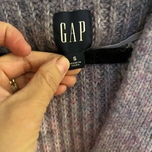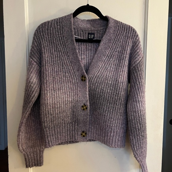 GAP women's ribbed knit cardigan in soft lilac. V-neck with three tortoiseshell-style.