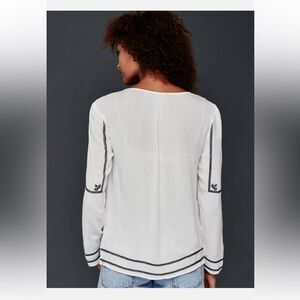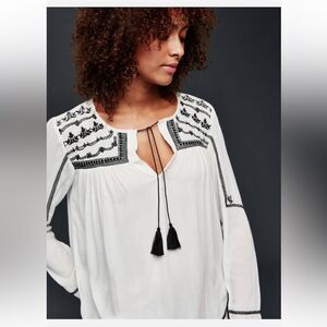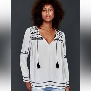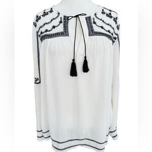 GAP Long sleeve split neck tassel white /black embroidered blouse Size L