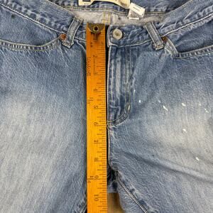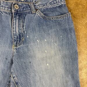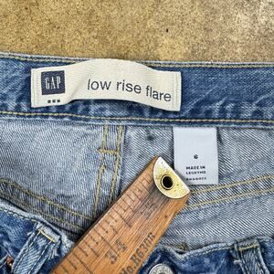 These vintage GAP low rise flare jeans capture early 2000s Y2K style with their faded light wash and wide leg silhouette. Made from 100% cotton denim, they feature a classic five-pocket design and a flattering flare cut. This pair shows natural wear and character, including faint discoloration and white paint speckling across the front, adding a grunge, lived-in look that fits right in with current vintage trends.