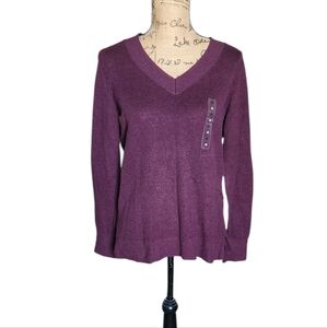 Cozy maroon knit sweater with a classic V-neck design. Perfect for layering.