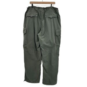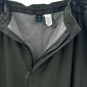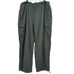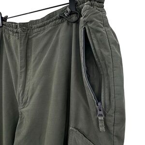 GAP men's baggy cargo pants in a olive/army green nylon/cotton blend. Lined with gray jersey material make them warm in the winter. Bungee cord waist, zippered pockets, velcro cargo pockets, bungee cord ankles.