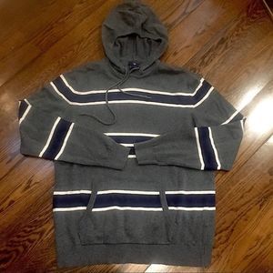 GAP Mens Charcoal Grey Knit Stripe Sweater with Drawstring Hood Navy Blue and White Stripes