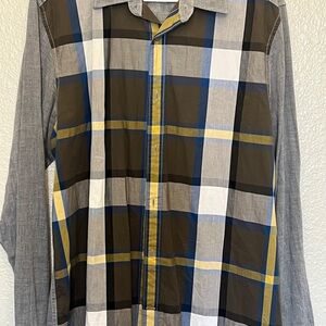 GAP men's button-up shirt in gray and olive. Features a classic collar and button closure.