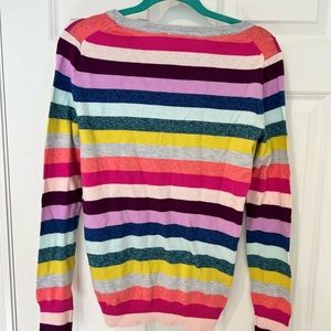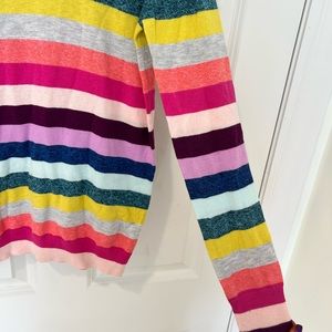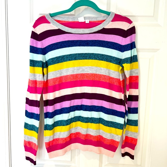 GAP long-sleeve sweater with bold horizontal stripes. Bright multicolor design featuring pink, yellow, blue, purple and white tones. Lightweight knit with a relaxed fit. Classic crew neckline. Vibrant, playful look for casual wear.