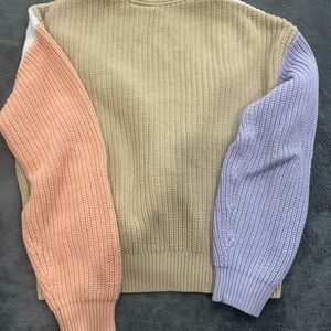 Chic cardigan with white, purple, and tan sleeves. Features button-up front. 100% cotton