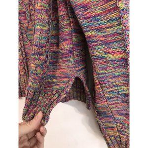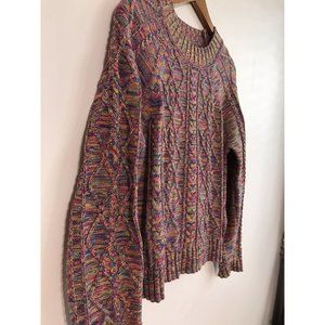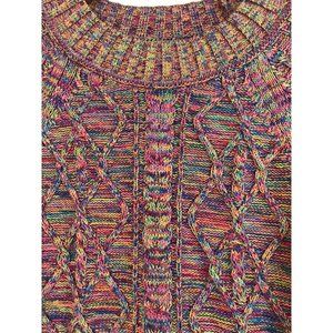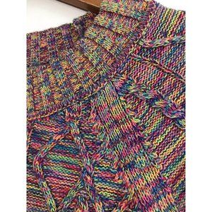 Cozy knit sweater with vibrant multicolor pattern. Features intricate cable design. Perfect for layering.