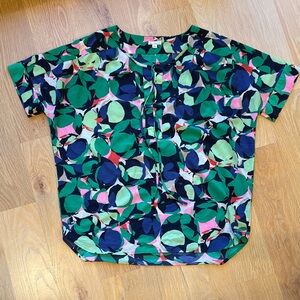 Stylish top with a unique camouflage pattern. Features green, pink, and black hues.