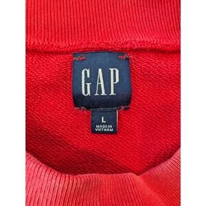 GAP NYC crewneck sweatshirt in a soft, washed red tone with a vintage-inspired "GAP NYC 1969 ORIGINAL" raised logo graphic on the front. Made from a midweight cotton-blend fabric with ribbed collar, cuffs, and hem. Slightly cropped fit and relaxed silhouette. Tagged size Large.