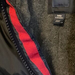 Cozy navy blue one piece. Features hood and mittens. Perfect for cold weather.