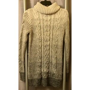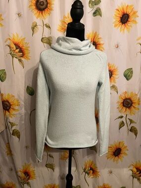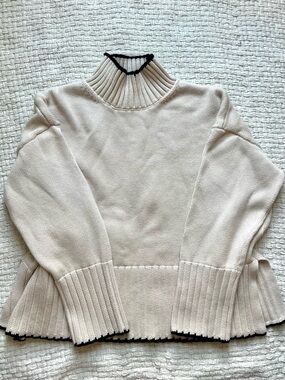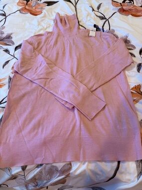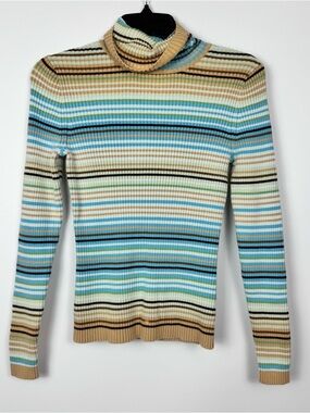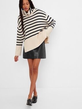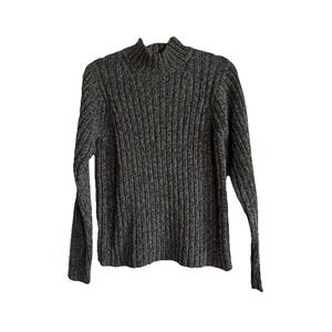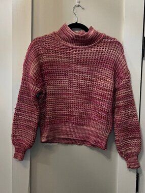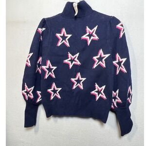 This GAP knit pullover sweater features a deep navy blue base with an allover bold star design outlined in white and pink. Designed with a cozy mock neckline and structured puff shoulders, it offers a statement-making yet comfortable option for cooler days.