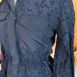 Stylish navy utility jacket. Features intricate detailing. Perfect for versatile wear.