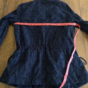 Stylish navy utility jacket. Features intricate detailing. Perfect for versatile wear.