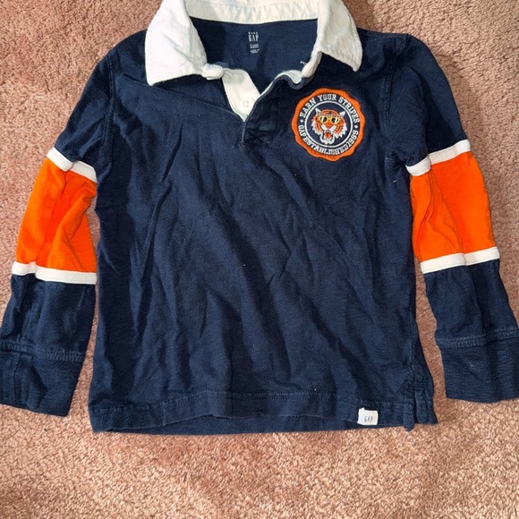 Navy shirt with vibrant orange accents. Features a classic button-down style. Ideal for casual wear.