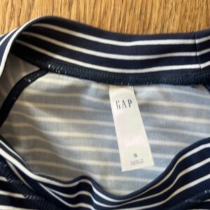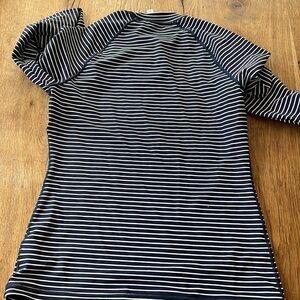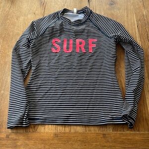 Navy and white striped coverup. Bold pink 'SURF' print. Long sleeves for sun protection.