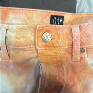 These GAP jean shorts feature a vibrant orange and white color pattern, perfect for a casual summer look. The distressed hem adds a trendy, laid-back touch to these stylish shorts.