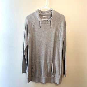 A GAP oversized gray rubbed sweater with a front pocket. A great top to wear with leggings for a comfortable day at home.