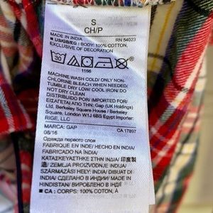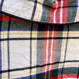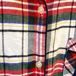 GAP + Pendleton Holiday Plaid Button Down Shirt/Pajama Top, Sz S. Soft cotton plaid shirt with navy satin piping seam detail and iconic GAP logo embroidered on front left breast pocket. Small collar. Red, green, navy blue, yellow and black. Button down with shirttail hem. Cuffs having piping, but no buttons. This could be worn as a shirt with dark jeans or as a short pajama top.