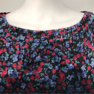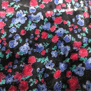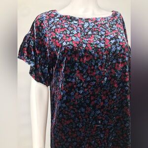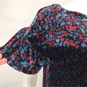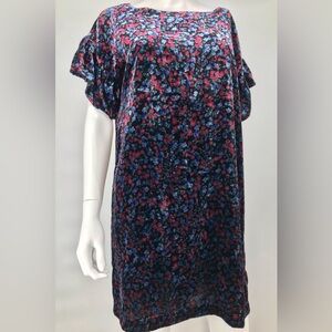 GAP Petite Moody Floral Velvet Dress. High neck. Cute ruffle sleeves. Black background with red, blue, and green floral. Velvet catches the light at different angles. Would look so cute with some tights and boots! Layflat measurements are chest 20.5, waist 20, hips 21, and center back length 32.5. Size Small