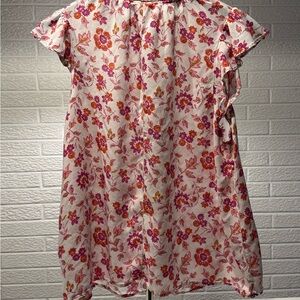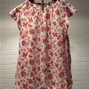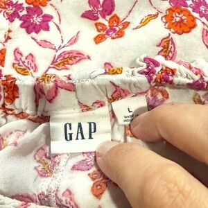 This casual top from GAP features a charming ruffled, tiered design in pink and red hues. With a crew neck and cap raglan sleeves, it offers a breezy, feminine style perfect for warm weather outings.