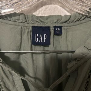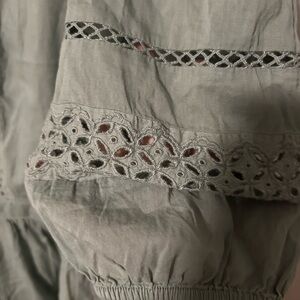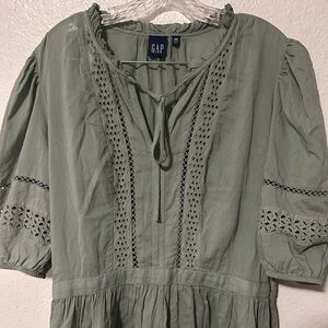 Chic prairie dress with lace details. Features a tie neckline and puff sleeves. Perfect for casual outings.