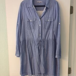 Stylish light blue button-up dress with a drawstring waist. Features long tab adjustable sleeves and chest pockets.