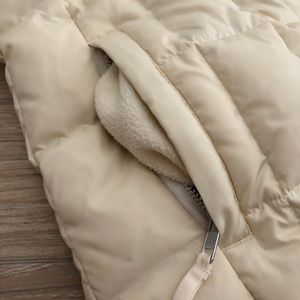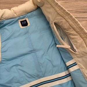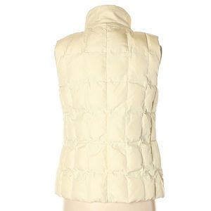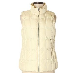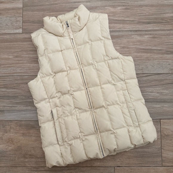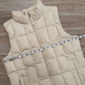 “The Warmest Vest” puffer vest by GAP. Size S. Cream. Down fill with fleece lined zip pockets. Left side interior pocket. Pre-owned. With a faint mark between the right pocket and side seam. Sold in as is condition. Measurements approximate. See all photos.