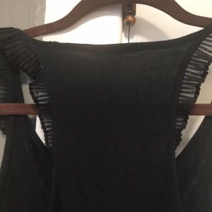 EUC racerback tank with ruffled detail around the neckline and on the back.