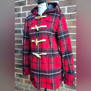 Chic red plaid utility jacket by GAP. Features stylish toggle closures. Ideal for layering.