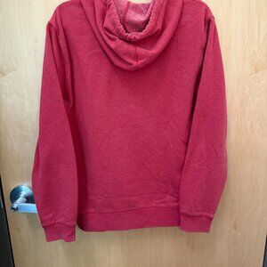GAP fleece-lined pullover hoodie in a bold red color with “San Francisco CALIF 1969” navy graphic across the chest. Features an adjustable drawstring hood, front kangaroo pocket, and soft interior. A great everyday hoodie with vintage college town vibes. Men’s size large. In gently used condition with slight fading on sleeves, but no holes or major flaws.