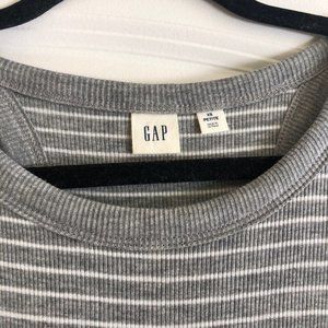 Features: super comfortable ribbed knit, thin grey and white striped, racerback style, side slit on right side, form fitting.