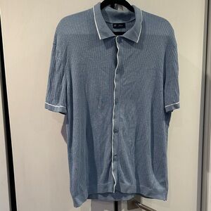 Casual blue shirt with button-down front. Features short sleeves and white trim. Ideal for relaxed outings.