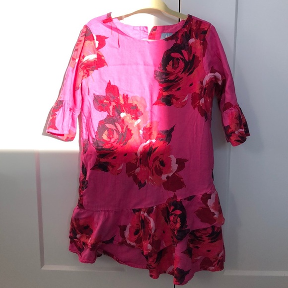 Full lined roses dress with bell sleeves and ruffle bottom. 3 button at neck in back. Size 4T