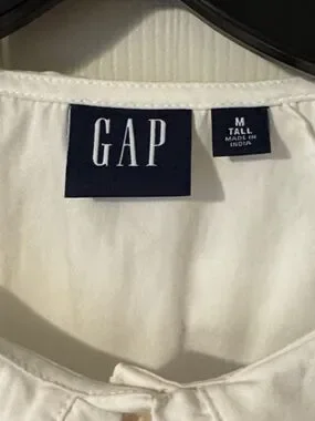 Gently used, in excellent condition, GAP rounded collar blouse in white. No rips or stains. Overall length is 24”, armpit to armpit is 19.5”, shoulder to shoulder is 14”, and sleeve length is 22”. Women’s size medium tall.