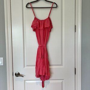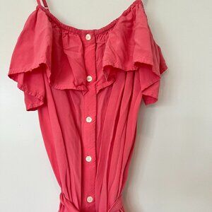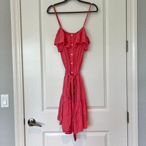 GAP Ruffle Cami Dress in pretty Apple Blossom Pink color. Adjustable spaghetti straps, buttons down the front with stylish tie front. Lightweight, flowy and flattering. Pristine like new - worn once. Size medium tall. Soft machine washable cotton poly blend (56% poly 44% cotton).