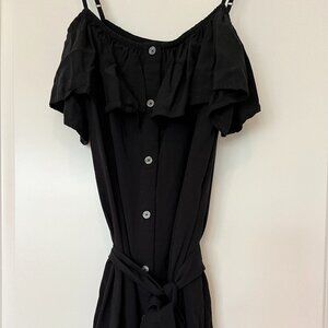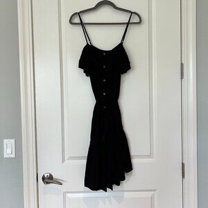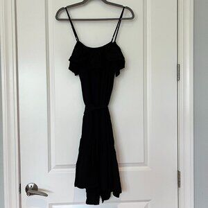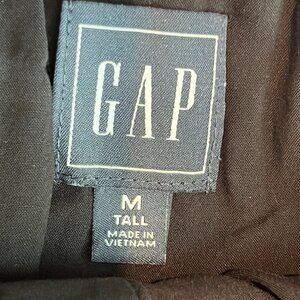 GAP Ruffle Cami Dress in black. Adjustable spaghetti straps, buttons down the front with stylish tie front. Lightweight, flowy and flattering. Size medium tall. Soft machine washable cotton poly blend (56% poly 44% cotton). New without tags.