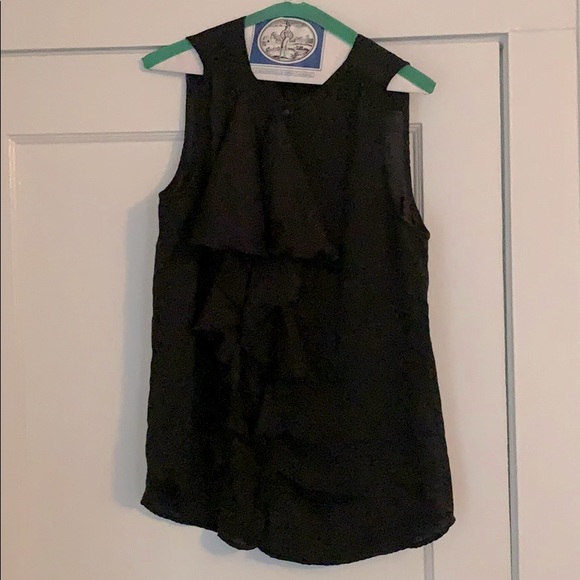 Sleeveless black top. Ruffles cascading down the front. Button-down. Great under a suit jacket. 100% Polyester.
